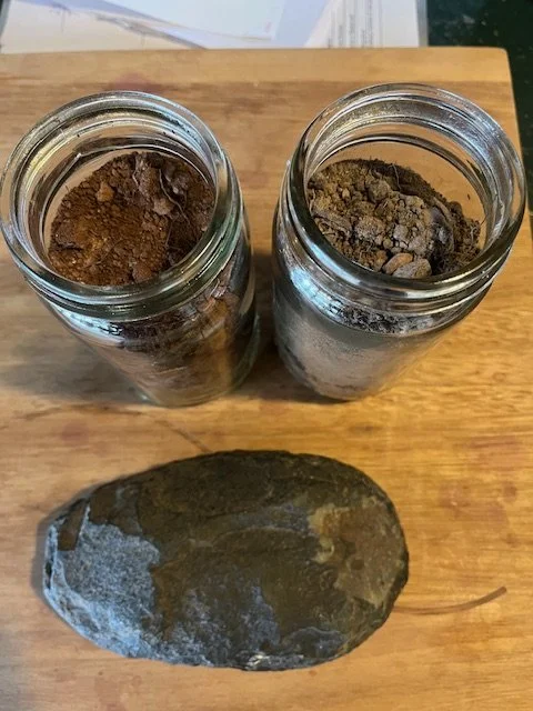 Cambrian soil where the chardonnay grows on and Granite soil where the Pinot Noir predominately grows on. A piece of greenstone.